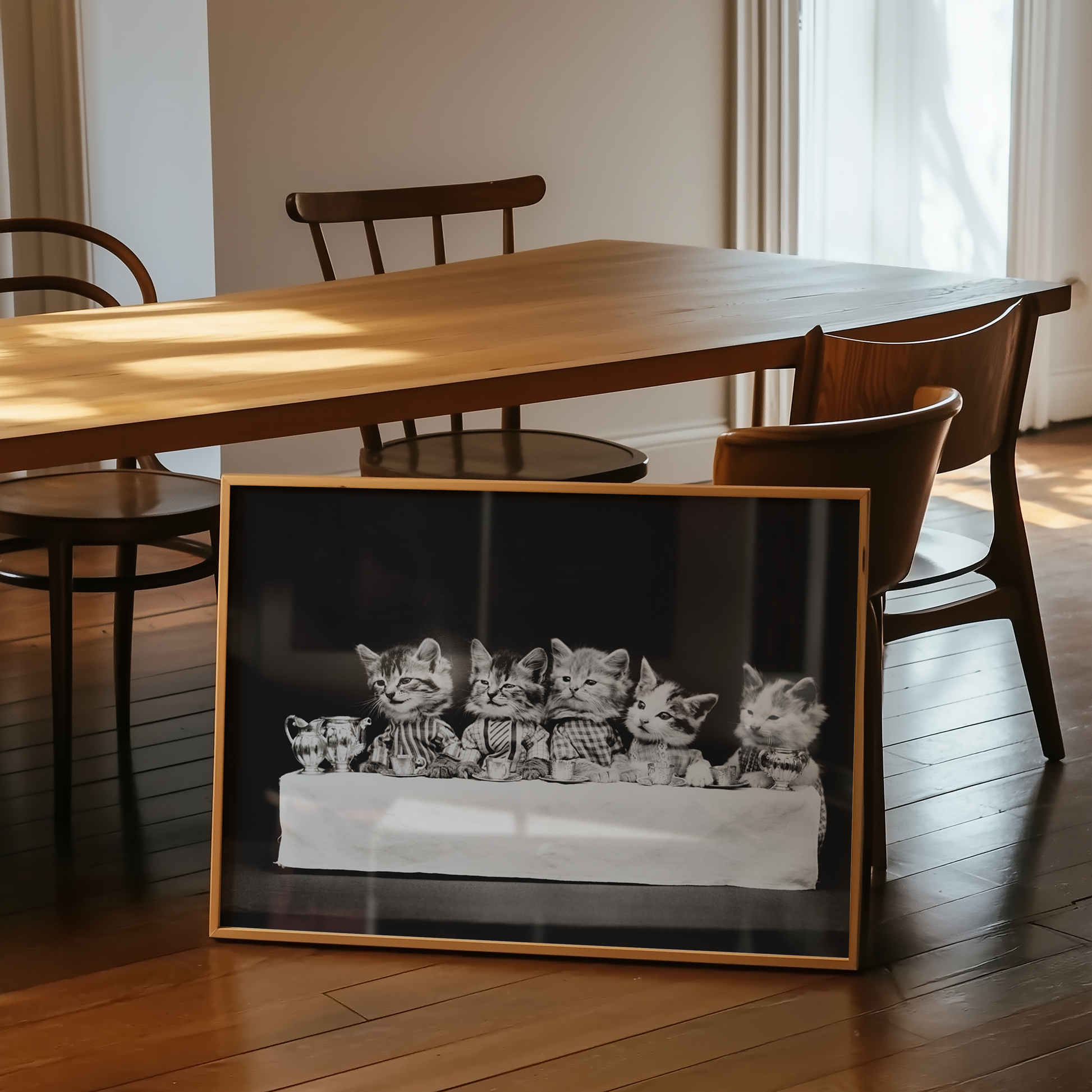 Sex kattungar i små kläder sitter prydligt runt ett tebord, ansiktena fulla av nyfikenhet och förväntan. Scenen är härligt iscensatt, men ändå överraskande naturlig – ett ikoniskt exempel på Frees mästerliga blandning av berättande och djurporträtt.