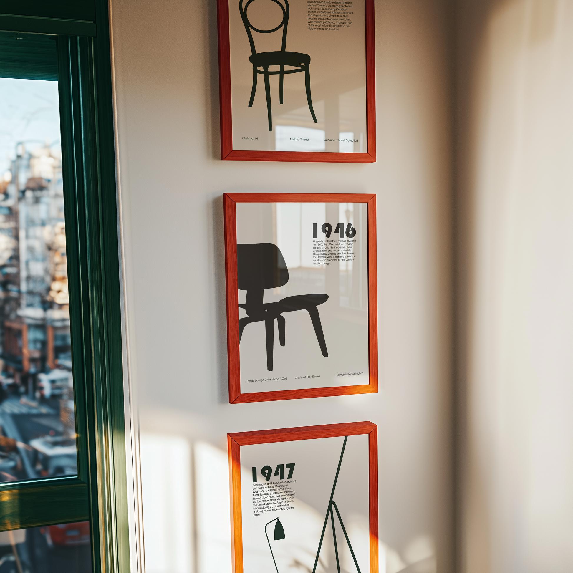 Denna poster hyllar Greta Magnusson Grossmans ikoniska Grasshopper-golvlampa, ett tidlöst stycke skandinavisk designhistoria. Den eleganta silhuetten fångar lampans distinkta bakåtlutade hållning och långa koniska skärm, vilket framhäver den lekfulla men arkitektoniska närvaro som gjorde designen berömd 1947.