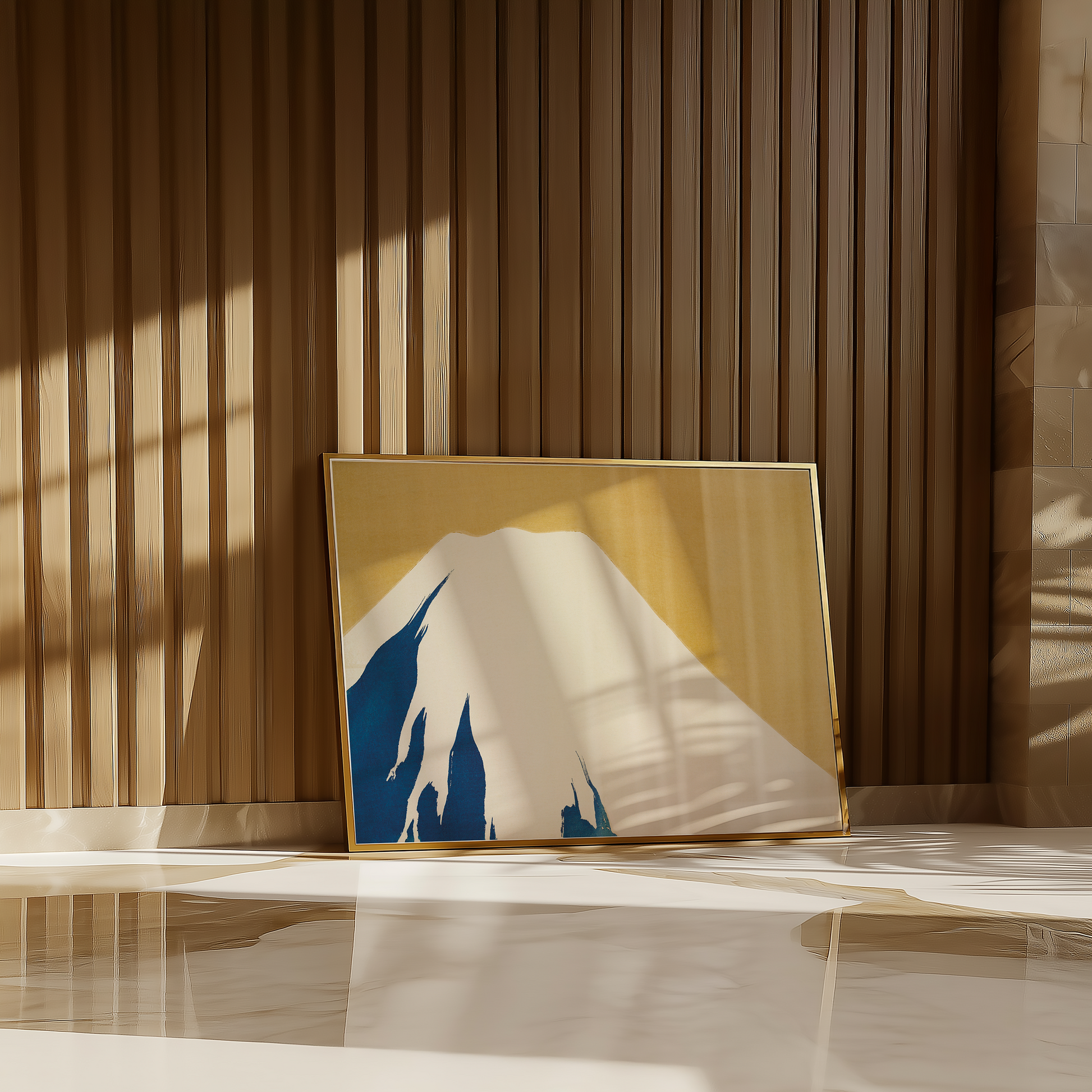 Denna fridfulla poster porträtterar berget Fuji som tyst reser sig över molnen, ett minimalistiskt uttryck för styrka och stillhet. Kamisaka Sekkas komposition reducerar landskapet till ren form och färg och förvandlar den ikoniska toppen till en symbol för fred och balans.