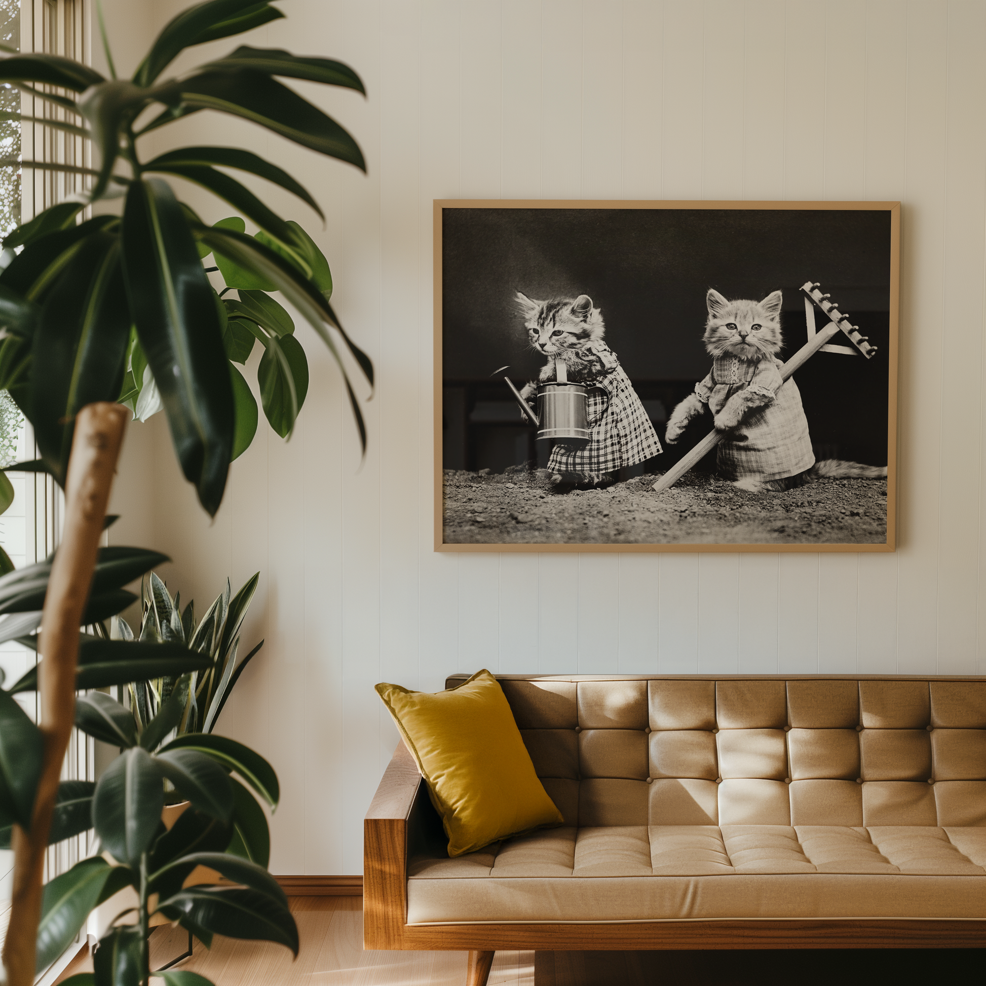 I små overaller och huvar tar två kattungar på sig uppgiften att vårens trädgårdsarbete med allvarliga ansikten och små verktyg i tass. "Planting time" är en förtjusande tablå som blandar pastoral nostalgi med Frees signaturfotografiska humor.