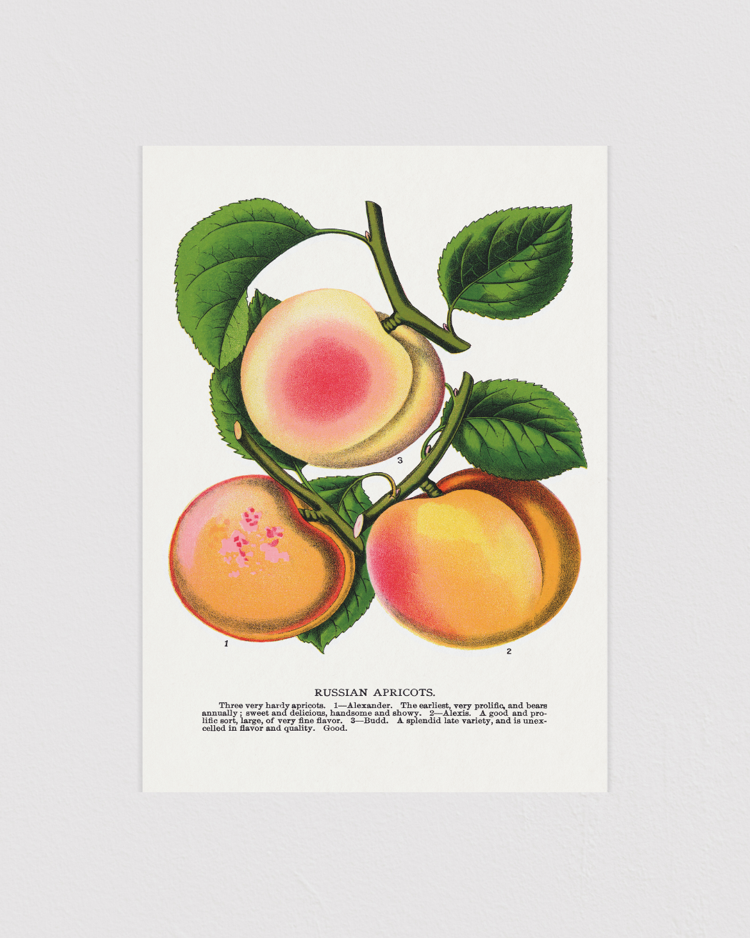 Denna vintageposter fångar den milda värmen från mogna ryska aprikoser med mjuka toner och botanisk precision. Det är en härlig hyllning till fruktträdgårdar och illustrationstekniker från 1800-talet.