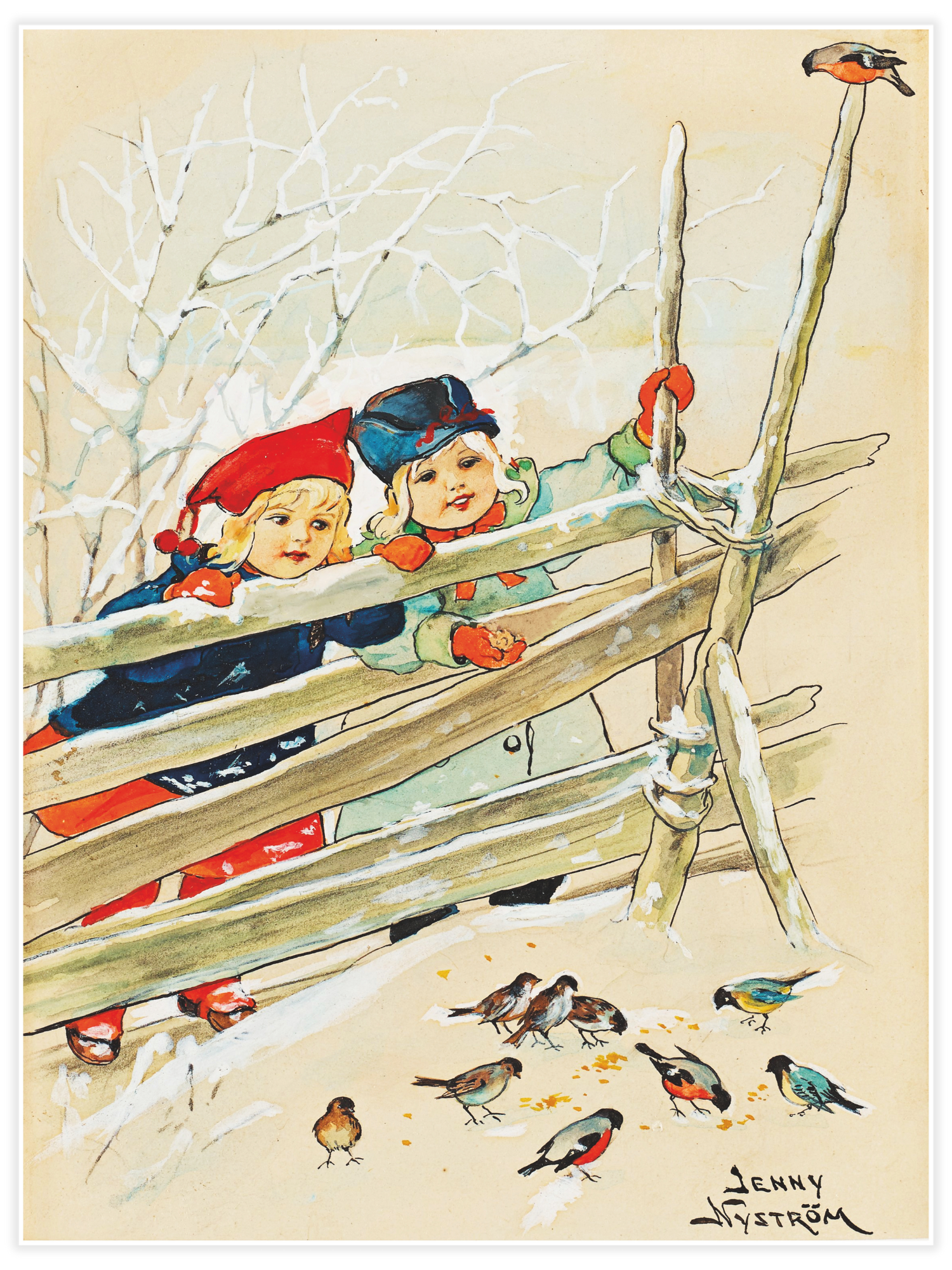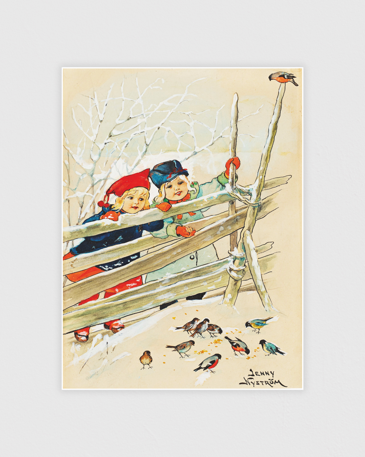 En charmig vintageillustration fylld med atmosfären av en gammaldags jul. De mjuka färgerna, lekfulla detaljerna och de milda uttrycken ger denna poster en varm och sentimental karaktär. Det är ett perfekt föremål för dig som älskar klassisk skandinavisk juldesign.