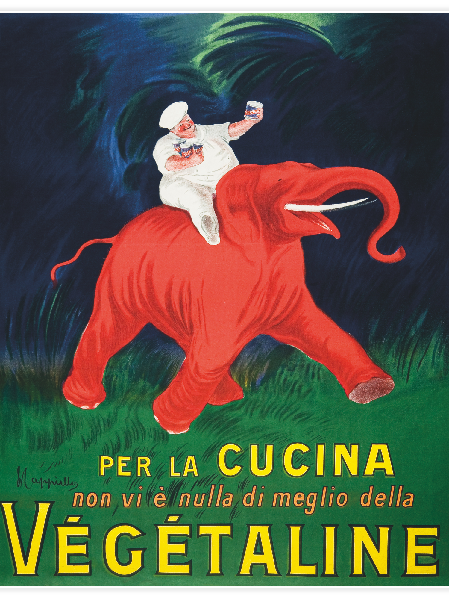 Vegetaline är en av Leonetto Cappiellos mest ikoniska designer, omedelbart igenkännbar genom sina djärva bilder och livfulla färgpaletter. Affischen fångar energi och effekt i en enda blick och visar upp Cappiellos banbrytande stil inom reklamkonst.