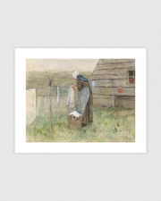 Detta delikata konstverk fångar en lugn lantlig scen, där en kvinna omsorgsfullt sköter sin tvätt mot bakgrund av ett rustikt trähus. Mauves mjuka, jordnära palett och uttrycksfulla penseldrag ger värme och realism till detta vardagliga ögonblick, vilket framkallar en känsla av nostalgi och enkelhet. Balansen mellan ljus och skugga, tillsammans med de strukturerade detaljerna, tillför djup och atmosfär, vilket gör detta tryck till en tidlös pjäs för alla utrymmen.