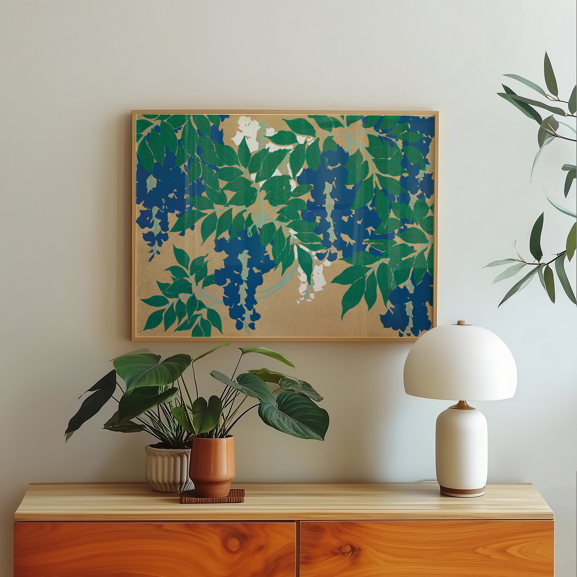 I denna delikata poster fångar Kamisaka Sekka den kaskadliknande skönheten hos blommande blåregn. De mjuka lila tonerna och den böljande kompositionen förkroppsligar harmonin mellan natur och design som definierar japansk konst. Varje kronblad tycks svaja mjukt i vinden, balanserat mellan precision och drömlik rörelse.